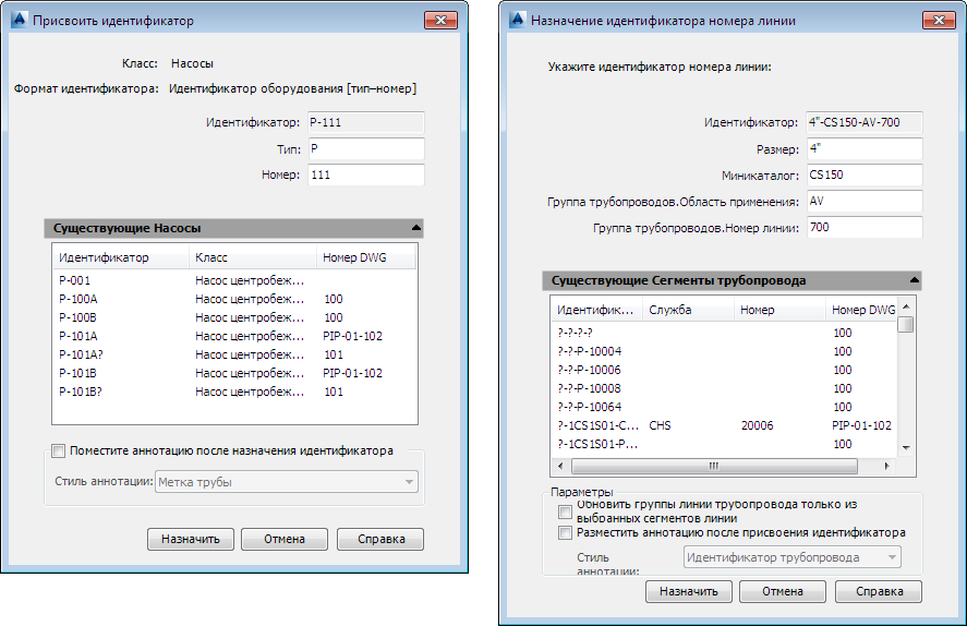 Каждый класс содержит свои типы полей идентификатора. Например, диалоговое окно для класса "Сегменты трубопровода" содержит поля "Идентификатор", "Размер", "Миникаталог" PipeLineGroup.Service и PipeLineGroup.LineNumber.