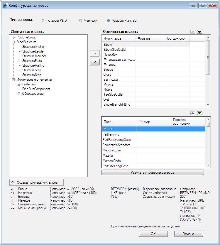 - В качестве типа запроса выберите классы P&ID, чертежи или классы Plant 3D.
