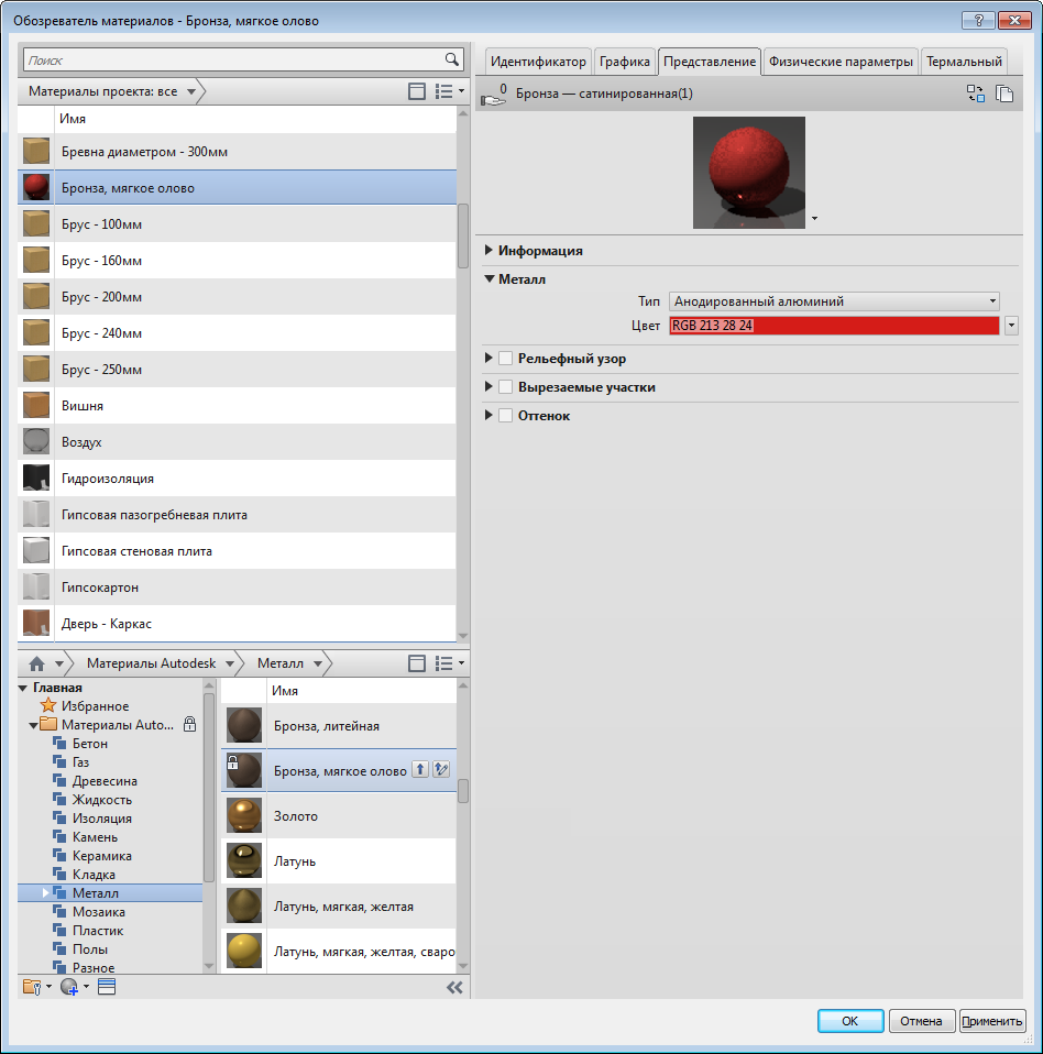 Свойства визуального образа группируются в один "набор характеристик" материала, и управление ими осуществляется на вкладке "Внешний вид". Управление другими наборами характеристик, связанными с материалом, осуществляется на соответствующей вкладке. Каждый набор характеристик можно изменять независимо друг от друга при редактировании существующего в проекте материала. Например, чтобы отображать бронзу красным цветом, можно заменить набор характеристик представления набором характеристик "Анодированный алюминий" с другими свойствами визуального образа.
