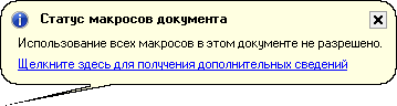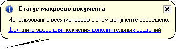 | Уровень безопасности макросов | Значок состояния | Уведомление при открытии |