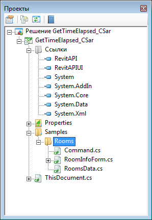 Если макрос представляет собой пользовательский интерфейс, в проект требуется добавить ссылки. Например, в макросе SampleRooms SDK необходимо добавить ссылки на следующие пространства имен: