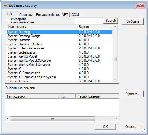 В диалоговом окне "Add Reference" найдите в списке и выберите System.Drawing и System.Windows.Forms. Выбор нескольких элементов выполняется при нажатой клавише Ctrl. Например: