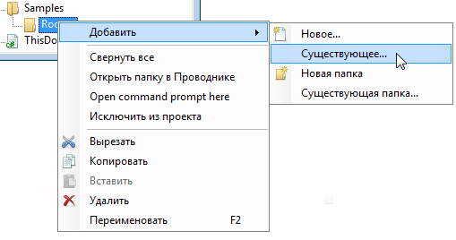 Вернитесь в среду Revit IDE. В "Проводнике проектов" (для продолжения работы над данными примером) щелкните правой кнопкой мыши на папке, созданной для макроса, и выберите в контекстном меню "Добавить"