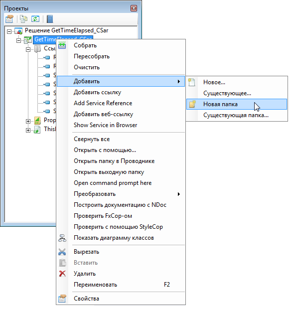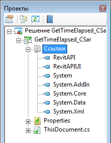 В данном примере обновленный проводник проекта IDE для GetTimeElapsed_CSharp содержит следующие компоненты: