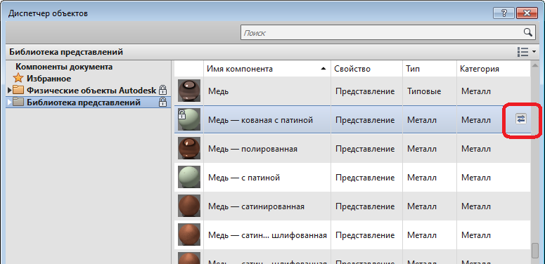 - Выберите материал в диалоговом окне "Диспетчер материалов".
