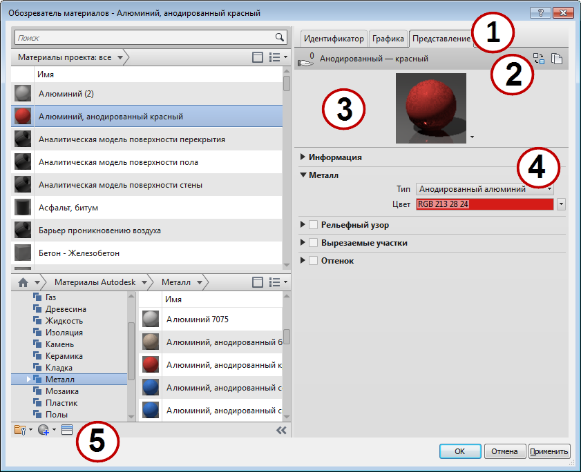 | 4 | Панель "Свойства": отображение и управление дополнительными свойствами выбранного набора характеристик. Имя и описание набора характеристик отображаются под раскрывающейся панелью "Информация". В приведенном выше примере показаны свойства металла, отображаемые (развернутые) для набора характеристик внешнего вида "Анодированный — красный". |