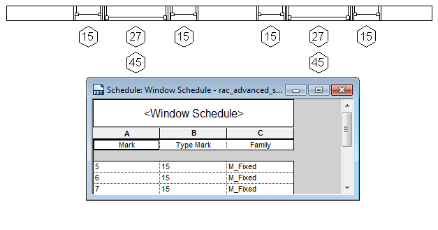На иллюстрации ниже приведено все то же тройное окно. В этом случае основой служит новое семейство окон, а центральное окно и два подъемных окна являются вложенными компонентами. Различия в маркировке и спецификации приведены на иллюстрации ниже.