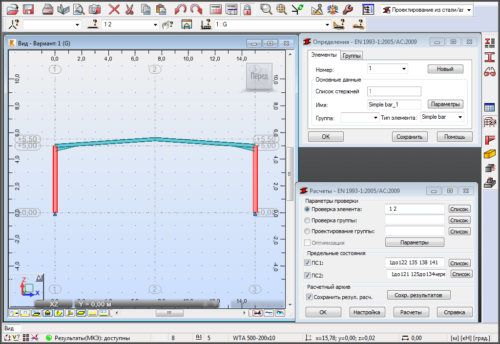 - Будет выполнен сброс компоновки экрана (показано на иллюстрации ниже) для отображения диалоговых окон "Определения" и "Расчеты", связанных с выбранными нормами. Открытие этих окон значительно облегчает оставшуюся часть процесса проверки конструкции.