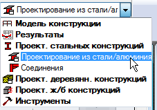 - На стандартной панели инструментов в раскрывающемся списке "Расположение" выберите Проект. стальных конструкций, а затем выберите Проектирование из стали/алюминия, как показано на рисунке ниже.