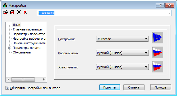 В диалоговом окне "Настройки" в области "Языки" установите для параметра "Региональные настройки" значение "Еврокод", как показано ниже.