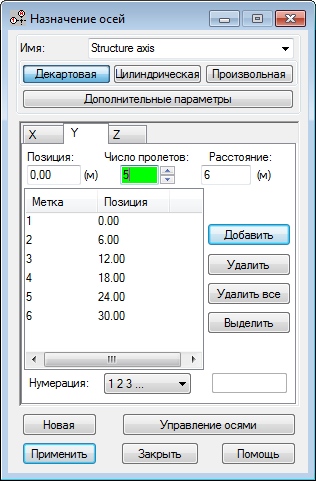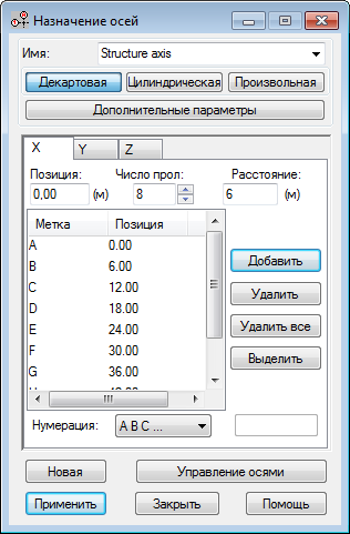В диалоговом окне "Ось конструкции" на вкладке X задайте для параметра Положение значение 0, для параметра Число прол." — 8, Расстояние — 6 (м) и Нумерация — A B C..., а затем нажмите кнопку Добавить. На вкладке Y задайте для параметра Положение значение 0, Число пролетов. - 5, Расстояние - 6 и Нумерация - 1 2 3 ..., как показано на рисунке ниже.