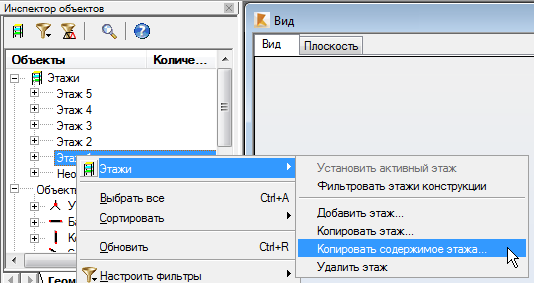 В диалоговом окне "Инспектор объектов" щелкните правой кнопкой мыши на Этаж 1 и выберите Этажи > Копировать содержимое этажа..., как показано ниже.