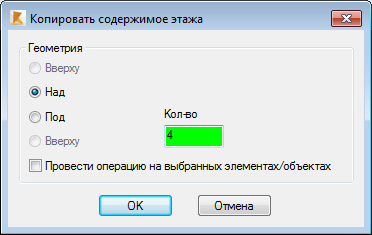 В диалоговом окне "Копирование содержимого этажа" задайте для параметра Геометрия значение Над и для параметра Количество повторов - 4, как показано на рисунке ниже.