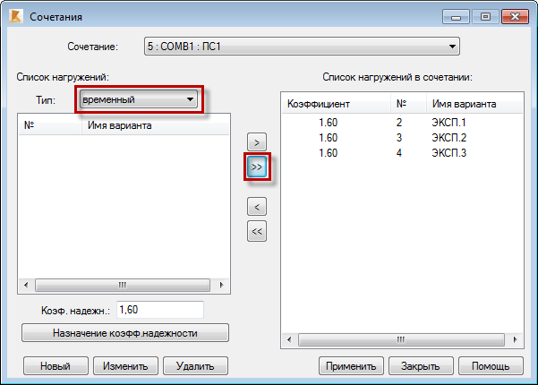 для переноса всех временных вариантов нагружений из левой панели в список вариантов в сочетании в правой панели.