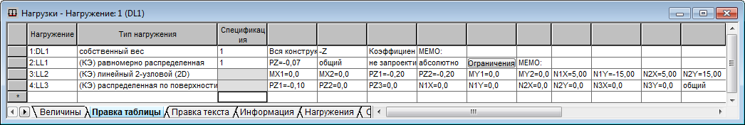 Совет: Для изменения заданных нагрузок можно использовать таблицу "Нагрузки". Например, можно изменить типы нагрузок, список элементов, к которым прикладываются нагрузки и значения этих нагрузок. Можно также использовать эту таблицу для добавления новых нагрузок на конструкцию.