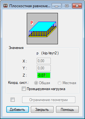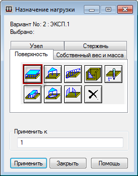 Поместите курсор в поле "Применить к" и введите 1, чтобы указать плиту, к которой требуется приложить плоскостную равномерно-распределенную нагрузку.