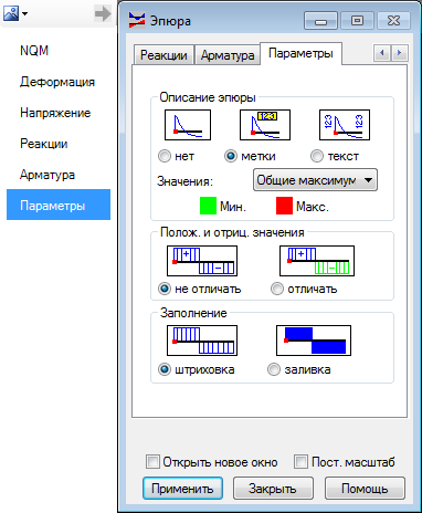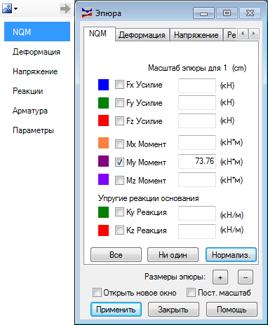Для отображения числовых значений внутренних усилий перейдите на вкладку Параметры.