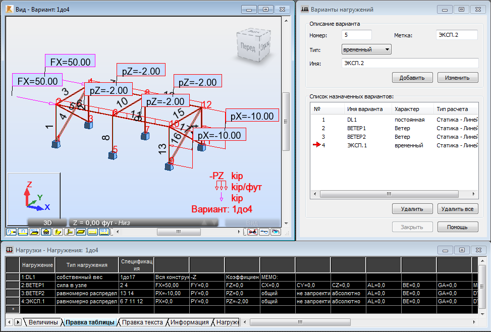 Прим.: Для изменения заданных нагрузок можно использовать таблицу "Нагрузки - Варианты". Например, можно изменить типы нагрузок, список элементов, к которым прикладываются нагрузки и значения этих нагрузок. Можно также использовать эту таблицу для добавления новых нагрузок на конструкцию.