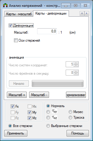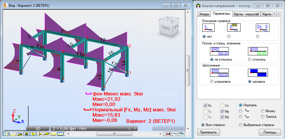 Будет открыто дополнительное окно, отображающее конструкцию с формами сечений и точными картами напряжений, как показано на рисунке ниже.