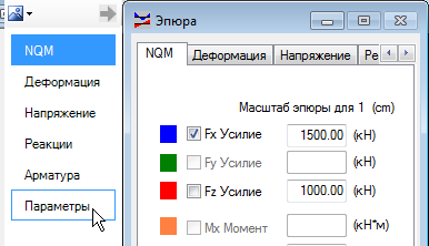 В диалоговом окне "Диаграммы" вы можете задать данные, которые требуется отобразить, включая внутренние силы (NQM) деформации, напряжения, реакции и армирование.