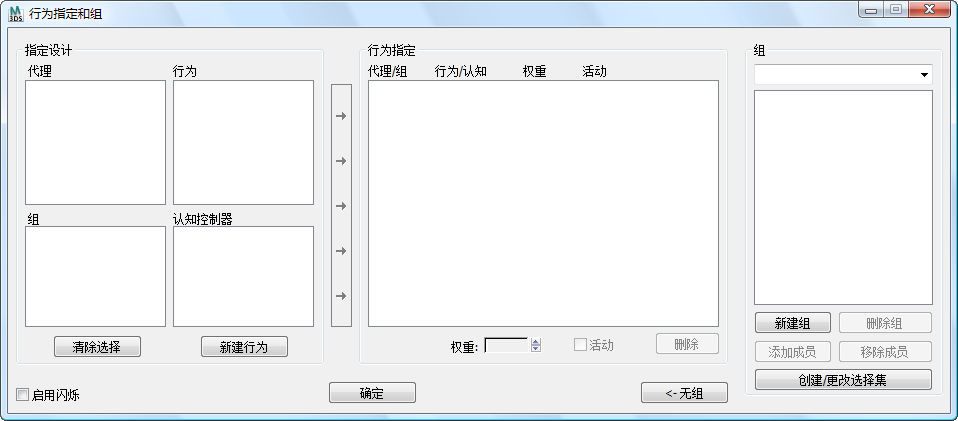 “行为指定和组合”对话框可用于将代理分组归类到组合,并为单个代理和组合指定行为和认知控制器。还可用于修改现有指定。