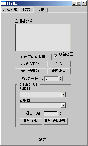 可以由自己明确地指定怎样在剪辑间进行混合,或者也可以让 character studio 自动计算混合参数。要指定混合,请使用下拉列表来选择所要混合的剪辑对,然后设置“混合开始”到“来自”剪辑中的帧上,混合从该帧处开始。另外,也可以使用“自动混合”或“自动混合全部”,来让 character studio 决定最佳混合点。