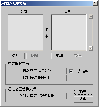 可以使用此对话框链接任意数量的代理对象对。还可以使用此对话框将对象与代理对齐,同时可以选择匹配比例因子。最后,可以指定使用代理的控制器的对象。