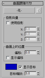 如果这些设置中只有一项不为 0,那么投影向量就与非零轴相对齐。非零值的组合设置为曲面追随创建倾斜平面。例如,要创建一个以世界 Y 轴为中心顺时针旋转 45 度的虚拟平面,需将 X 和 Z 设置为值 1,将 Y 设置为 0。此外,还可以将这三个轴全部设置为 0,即不指定向量,这样可以有效地禁用“使用投影”。