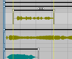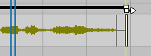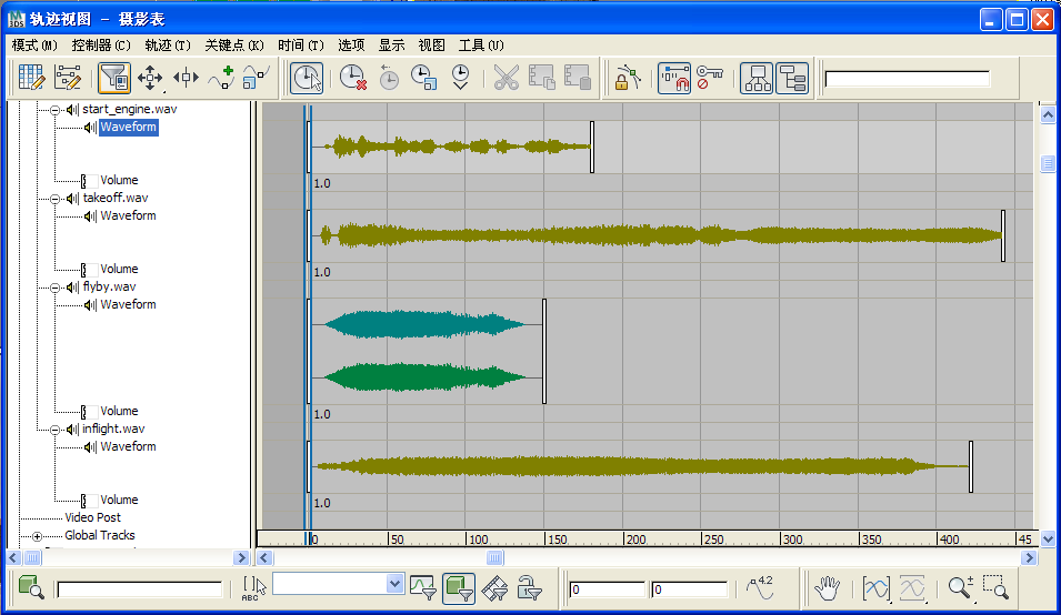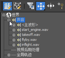 第一、第二和第四个声音轨迹以单声道方式录制,因此显示为单个波形。第三个声音轨迹 flyby.wav 以立体声方式录制,显示为两个波形,一个表示左声道,另一个表示右声道。