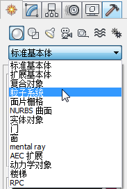 (几何体)。打开“对象”下拉列表,再选择“粒子系统”。