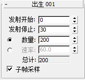 在“粒子视图”的右侧,“Birth 001”卷展栏显示与粒子创建相关的参数。“发射开始”和“发射停止”微调器指示粒子生成过程将始于第 0 帧,结束于第 30 帧。“数量”微调器指示系统将生成 200 个粒子。