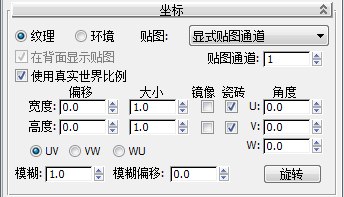 - 在“坐标”卷展栏中,禁用“使用真实世界比例”(若已启用),并确保“平铺”中的 U 和 V 设置为 1.0。