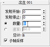 - 在“Birth 001”卷展栏中,将“发射停止”设置为 0(这可确保粒子不会随时间弹出),并将“数量”微调器设置为 6,以便仅创建六棵粒子树。