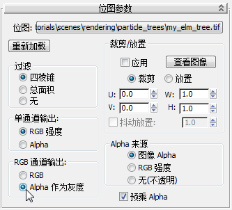 - 在“位图参数”卷展栏上,在“单通道输出”组中选择“Alpha”,然后在“RGB 通道输出”组中选择“Alpha 作为灰度”。
