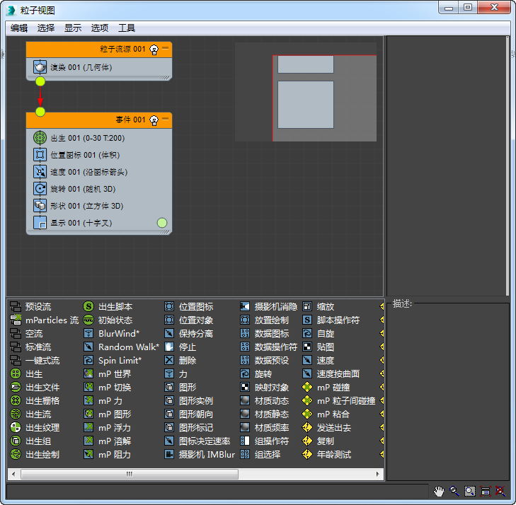 - “仓库”是操作符的列表,它测试显示在“粒子视图”窗口底部的内容。将 位置对象操作符从仓库中拖动到 Event 001 中,并将它置于位置图标 001 操作符的正上方。
