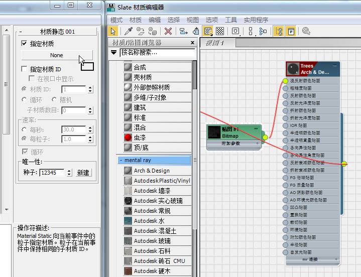 - 移动“粒子视图”和“Slate 材质编辑器”,以便能同时看到这两个窗口。在“粒子视图”中,高亮显示 Material Static 001 操作符,从 Trees 材质节点的输出套接字中拖出,然后在“粒子视图”中,将该材质置于“指定材质”按钮上(最初标记为“无”)。在 3ds Max 询问是使用副本还是实例时,请务必选择“实例”,然后单击“确定”。