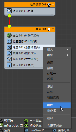 - 在“粒子视图”中,单击 Speed 001 操作符将它高亮显示,然后右键单击并选择“删除”,因为您不希望粒子树移动。