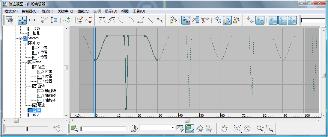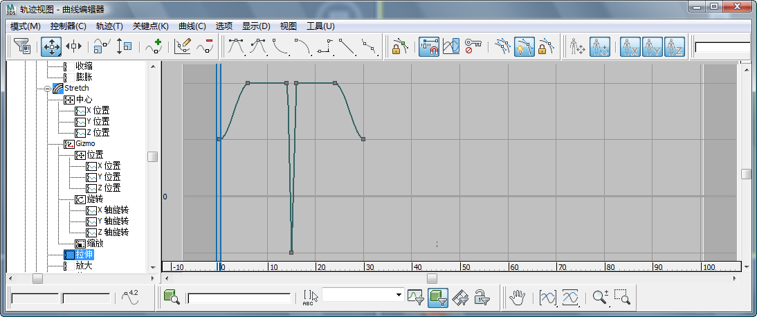 “控制器”窗口中,找到“拉伸”参数的轨迹。 层次结构看上去像“篮球”