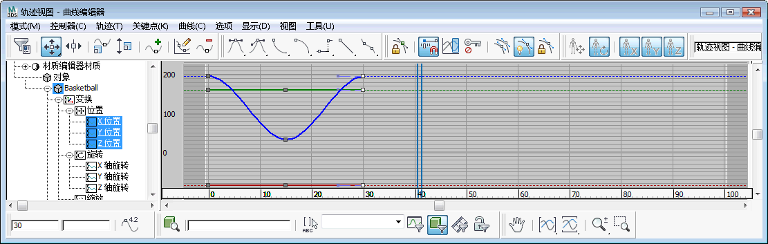 3ds Max 将打开“曲线编辑器”。刚刚创建的球轨迹会显示在左侧,而曲线本身会显示在右侧的曲线窗口中。