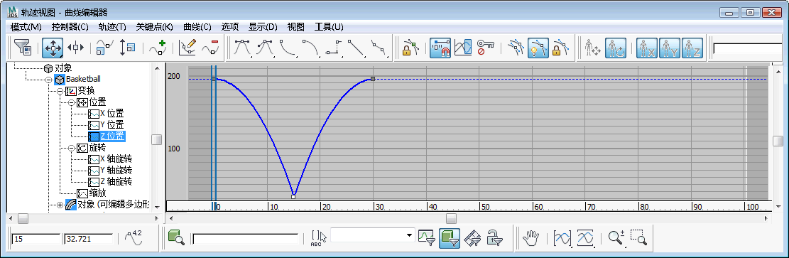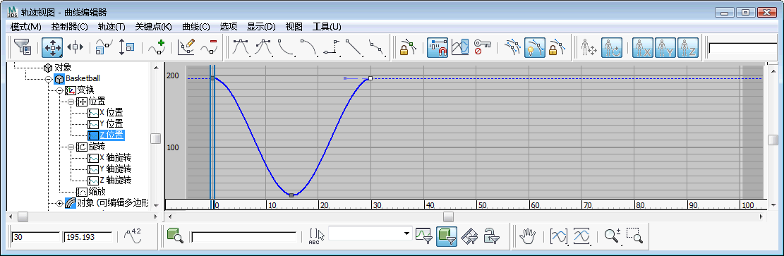 “控制器”窗口(左侧的对象和轨迹的列表)中,单击“Z 位置”轨迹以显示该轨迹的曲线。