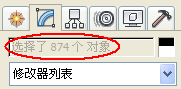 即会选中所有座位对象。在“修改”面板上,可以看到已选中 874 个对象:只比具有无效材质的对象总数 875 少一个对象。