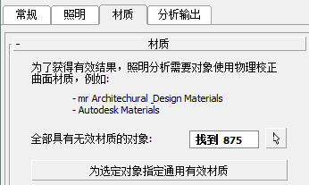 照明分析工具要求场景中的所有对象均使用物理校正曲面材质。仅允许指定了 mental ray“建筑与设计”材质或某种“Autodesk 材质”(包括来自“Autodesk 材质库”的材质)的对象。所有其他材质均视为无效。未指定材质的对象也会被视为无效。