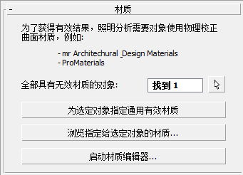 在“材质”卷展栏上,“具有无效材质的全部对象”字段将更新以显示仅剩余一个具有无效材质的对象。