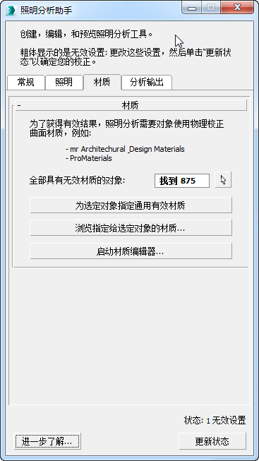 “材质“卷展栏 “具有无效材质的全部对象”框表示场景中存在 875 个无效对象,您必须立即对这些对象进行纠正。