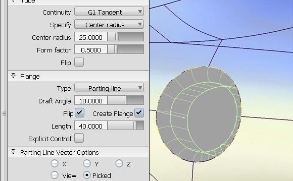 如果创建的管具有“G1 Tangent”连续性,则会使用 360 度的断面创建该管。创建凸缘时,会将其修剪为适当的断面。