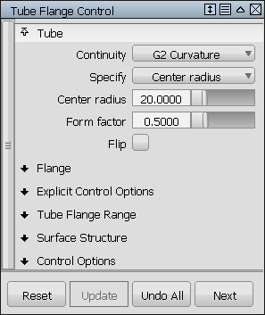 在圆角的端点,工具会创建一个称为凸缘的线性延伸。该工具使用的方法与“Tube”工具部分介绍的方法相同。