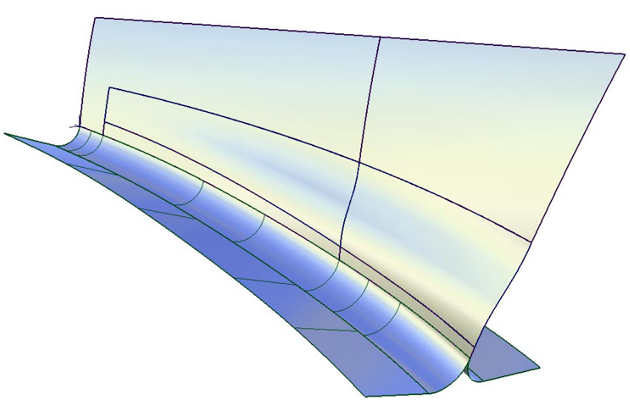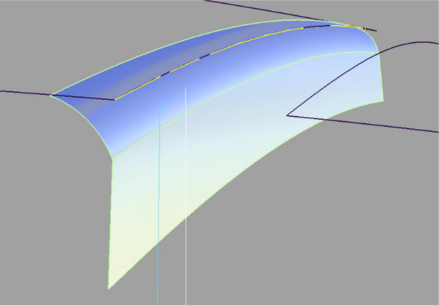 控制窗口的“Surface Structure”部分提供的选项用于修改生成的几何体的跨距分布。将“Surface Type”设置为“Single surface”会创建单个圆角曲面,否则圆角会在曲线边界(也包括曲面边界)进行分割,因为曲线的跨距不能超过一个曲面。对于多跨距几何体,这会为您带来更好的结果。