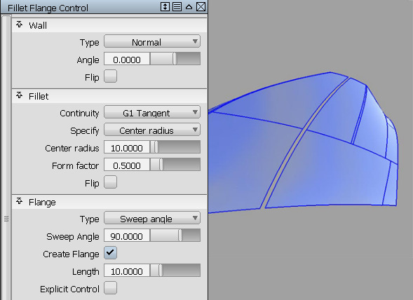 变量参数(半径、凸缘角度或凸缘长度 — 由控制窗口中的“Variable”指定)使用建模窗口中的一组操纵器进行控制。其中,只有一个参数是可变的,其他两个参数都保持为恒定。