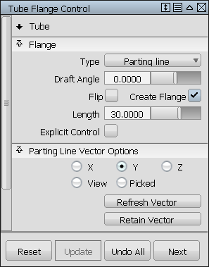 工具将根据向量(用鼠标左键单击它进行选择,或通过选项窗口指定)分析分模线,并创建称为凸缘的线性延伸。