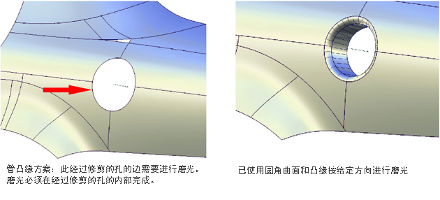 以下两个示例说明磨光曲面边的两种主要情况。第一种情况是,有一条需要添加边磨光(由圆角和凸缘组成)的预定义相交曲线。